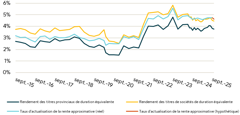Le taux de rente approximatif (réel) représente l’écart approprié à ajouter aux rendements moyens des obligations négociables du gouvernement du Canada de plus de 10 ans (série V39062 du CANSIM) comme approximation du rendement provenant de la souscription de rentes pour un régime de retraite de durée moyenne, tel qu’il est publié dans la note éducative sur les hypothèses pour les évaluations de liquidation hypothétique et de solvabilité à différentes dates de calcul de l’Institut canadien des actuaires (« ICA ») (la « note éducative de l’ICA »). Les taux d’obligations de sociétés et d’obligations provinciales de duration équivalente correspondent aux taux neutres quant à la duration (par rapport au passif) basés sur une combinaison d’indices d’obligations de sociétés et d’obligations provinciales à moyen et à long terme de FTSE Canada. Le taux de rente approximatif (hypothétique) se base sur un modèle d’autorégression interne de Gestion SLC qui cherche à expliquer la « moyenne des trois prix hypothétiques les plus concurrentiels » historique (les « prix hypothétiques »), telle qu’elle est publiée dans la note éducative de l’ICA, en utilisant les écarts des obligations provinciales et des obligations de sociétés suivies par FTSE Canada et l’évolution de la forme de la courbe des taux sans risque du gouvernement du Canada comme variables explicatives. Conformément à la note éducative de l’ICA, l’ICA accorde de l’importance aux prix hypothétiques lors de l’établissement des conseils sur les taux de rente approximatifs, en plus des données recueillies sur des achats réels de rentes et des prix de bonne foi. Il est entendu que les achats réels et les prix de bonne foi utilisés par l’ICA ne sont pas accessibles au public et n’ont pas été pris en compte dans l’établissement du taux de rente approximatif (hypothétique).