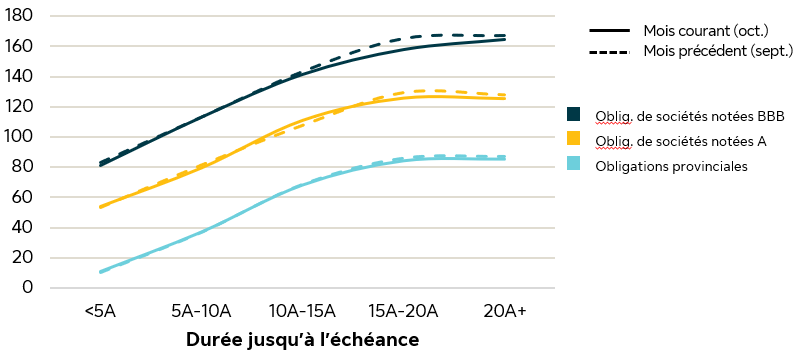 Les écarts de taux des obligations de sociétés canadiennes se sont modérément resserrés en octobre, ce qui a prolongé la tendance observée en septembre. Les écarts de taux se sont resserrés dans plusieurs secteurs, et les titres de sociétés de télécommunications à longue échéance ont surperformé dans un contexte de spéculations quant à des rachats futurs. Les nouvelles émissions d’obligations de sociétés ont atteint 11 G$ pour le mois, un résultat solide, mais légèrement inférieur au record de septembre, portant le total des émissions depuis le début de l’année à 128 G$. L’activité est demeurée très diversifiée, avec une offre importante des fiducies de placement immobilier (FPI) et du secteur des produits financiers.
