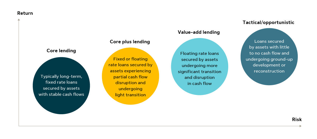 The investable landscape of CRE debt is multifaceted and spans opportunities across the risk/return spectrum. It includes long-term fixed-rate loans secured by assets with stable cash flows (known as Core lending) at the lower end, through loans secured by assets with little to no cash flow that are undergoing transitional business plans such as development or reconstruction initiatives (known as tactical or opportunistic lending) at the higher end.