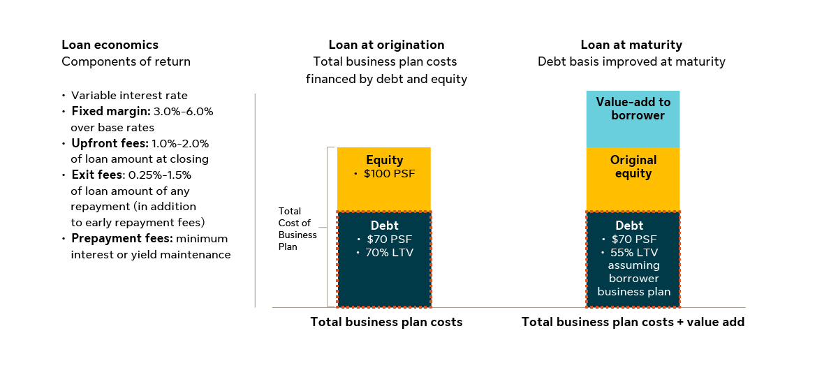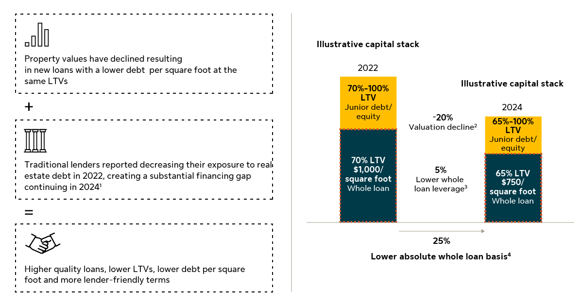 In addition, the CRE market has experienced meaningful value correction. This means loans are now generally originated at a lower basis, translating into lower debt per square foot for the same LTVs. Combining this with less available debt capital means alternative lenders can originate loans at attractive entry points to produce strong risk-adjusted returns. This could be even more compelling in value-add CRE lending as borrowers are further derisking loans with their value-add business plan initiatives.