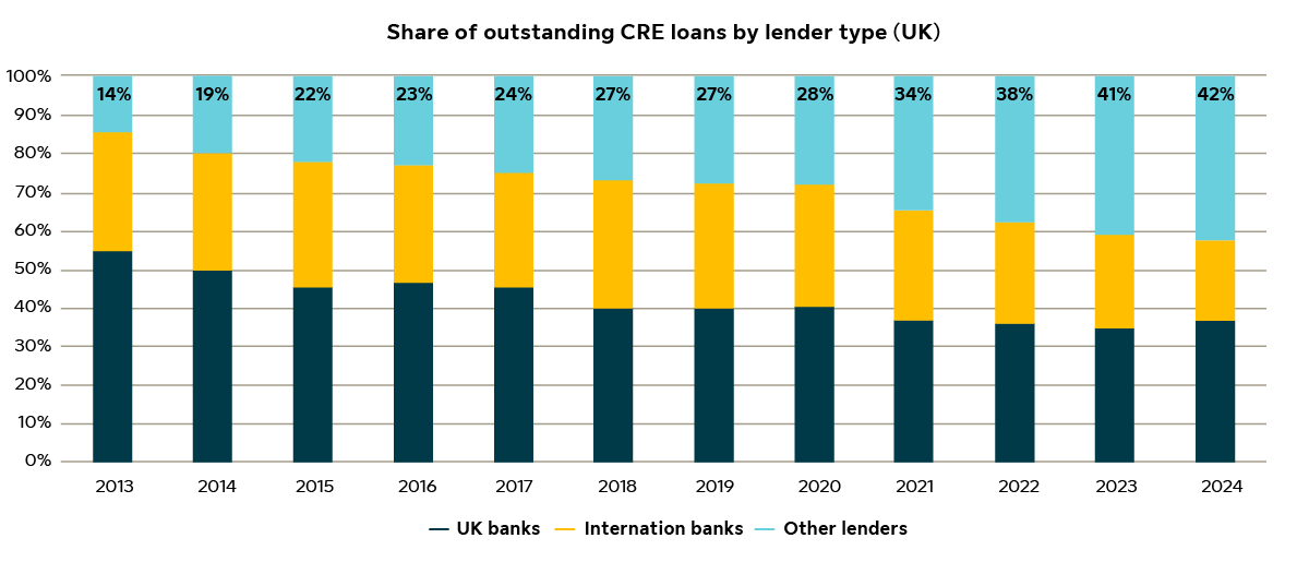 - As traditional lenders such as banks have reduced their activity in the asset class, alternative asset managers have gained increased market share, representing more investment opportunities for investors.