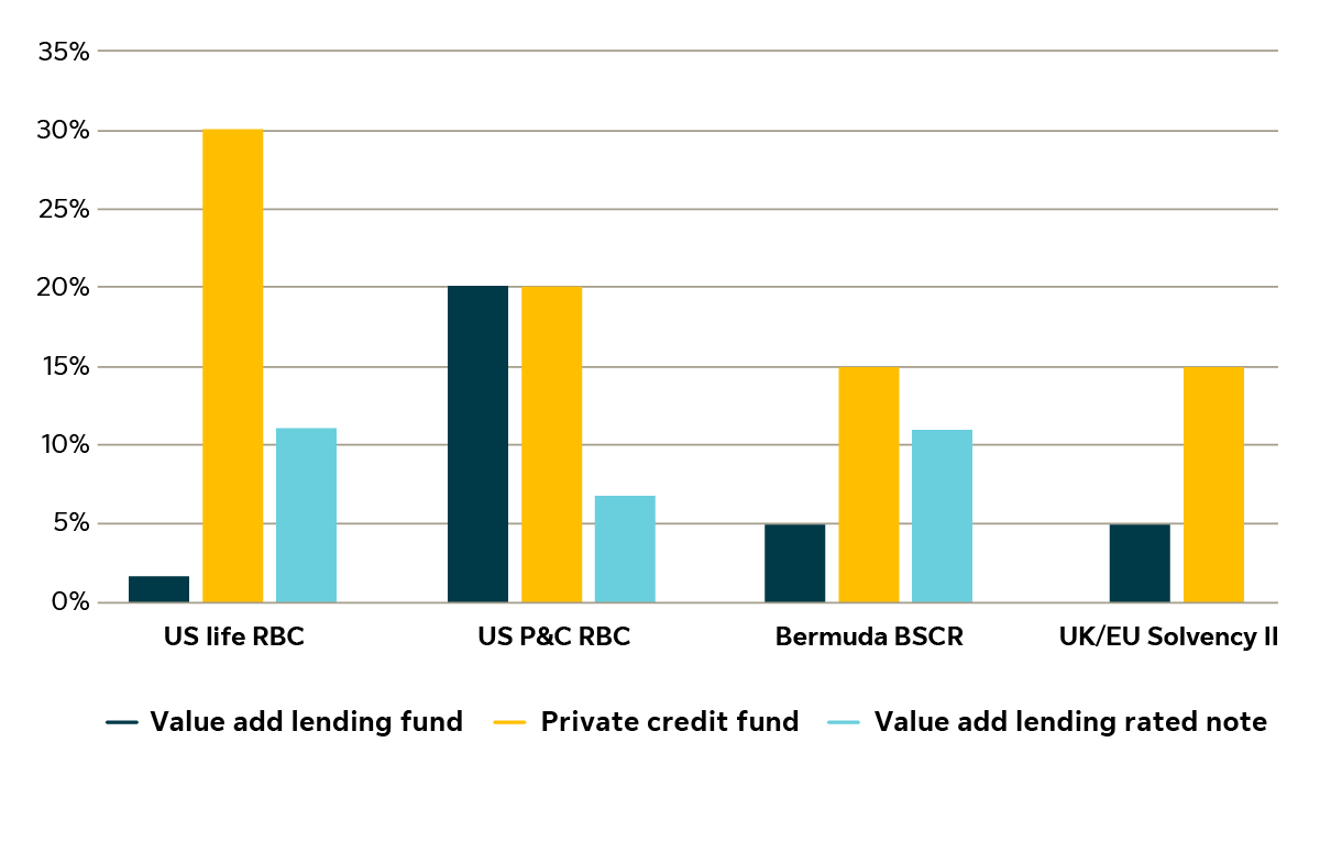 Source: NAIC, BMA, EIOPA, SLC Management analysis. Assumes no fund level leverage. Bermuda BSCR and Solvency II capital charges assume look through to underlying securities. For BSCR, private credit assumed average rating = B. For Solvency II, Value Add Lending Fund capital charge assumes an effective duration of 2.5 years and credit quality 4 (CM3); private credit fund capital charge assumes no ECAI credit assessment available for underlying collateral and effective duration of 5 years. Rated note assumes tranches of 50% BBB, 30% BB, and 20% equity.